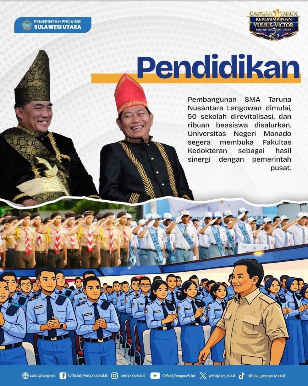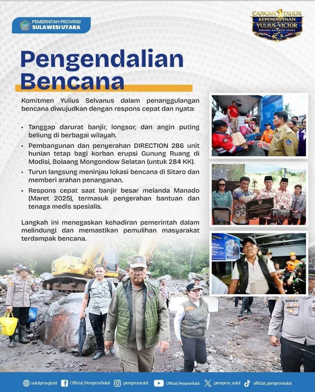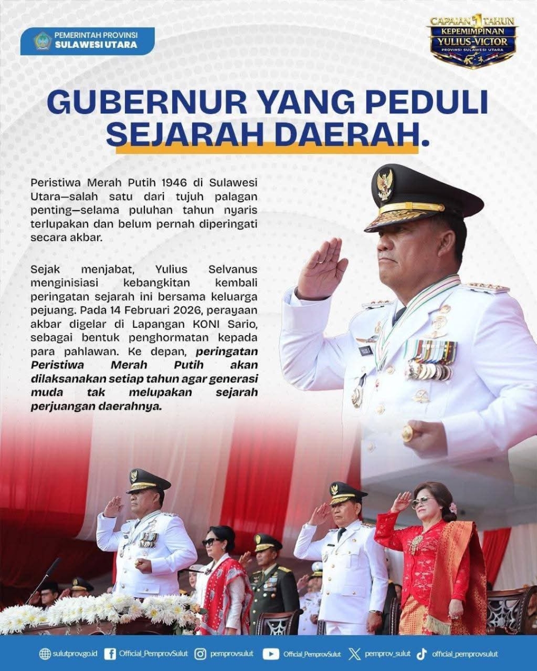 Dalam sambutannya, Yulius mengakui bahwa perjalanan satu tahun ini bukan hanya hasil kerja kolektif, tetapi juga didorong oleh arahan langsung dari Presiden Prabowo. “Perintah khusus Bapak Presiden menjadi pijat kami dalam merancang dan melaksanakan program-program yang benar-benar menyentuh kebutuhan rakyat Sulut. Kami tidak bekerja sembarangan, melainkan dengan arah yang jelas demi mewujudkan visi daerah yang sejalan dengan visi nasional,” tegas Yulius.