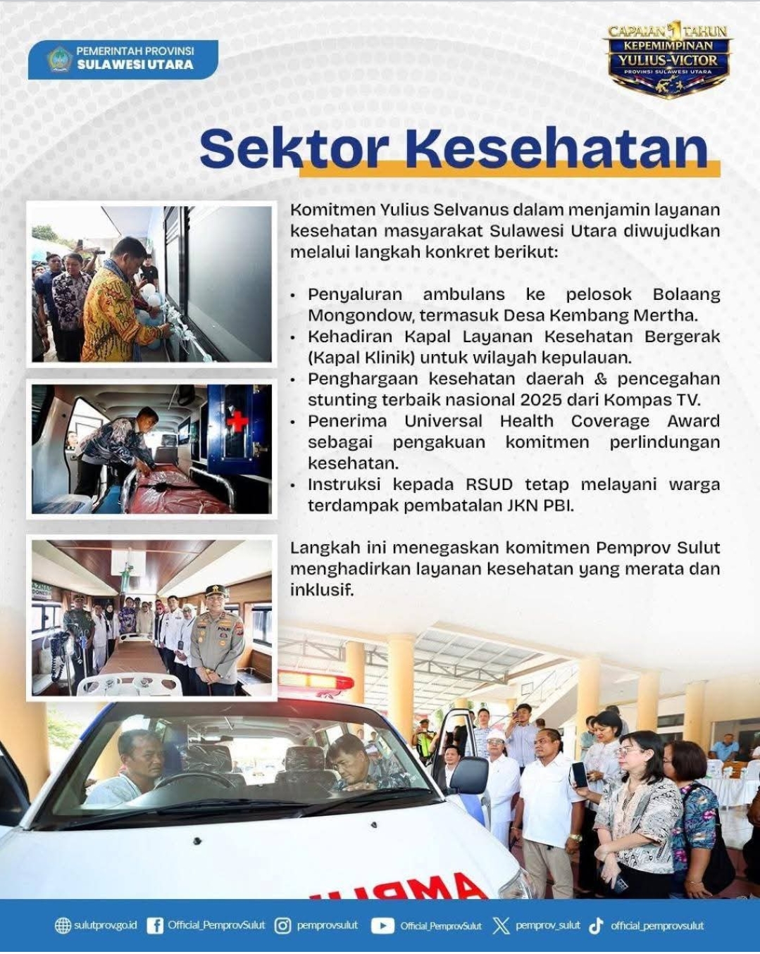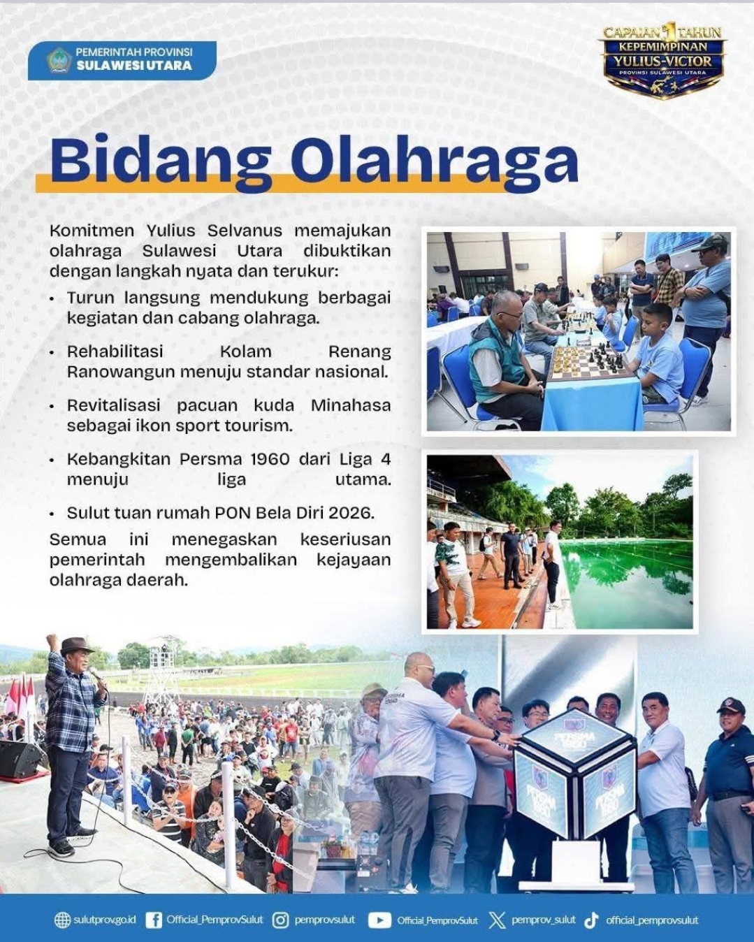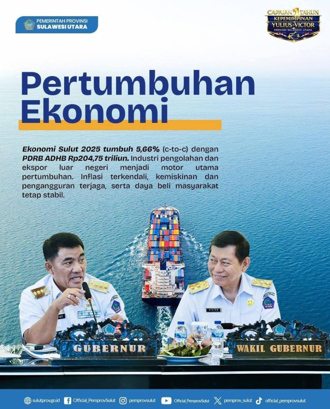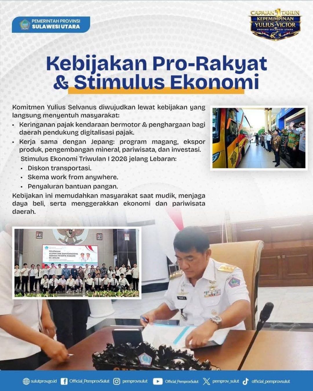 Dalam sambutannya, Yulius mengakui bahwa perjalanan satu tahun ini bukan hanya hasil kerja kolektif, tetapi juga didorong oleh arahan langsung dari Presiden Prabowo. “Perintah khusus Bapak Presiden menjadi pijat kami dalam merancang dan melaksanakan program-program yang benar-benar menyentuh kebutuhan rakyat Sulut. Kami tidak bekerja sembarangan, melainkan dengan arah yang jelas demi mewujudkan visi daerah yang sejalan dengan visi nasional,” tegas Yulius.