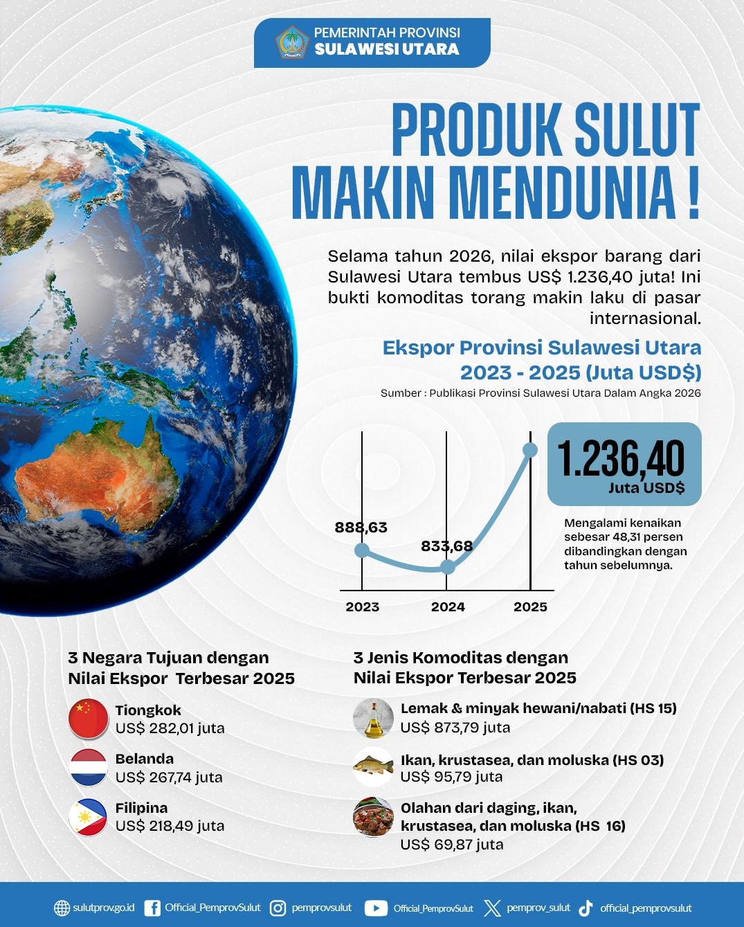 Di pasar internasional, produk-produk asal Sulut semakin menunjukkan daya saing. Nilai ekspor barang dari Sulut sepanjang tahun 2025 sukses menembus angka US$ 1.236,40 juta, mengalami kenaikan sebesar 48,31% dibandingkan tahun sebelumnya.